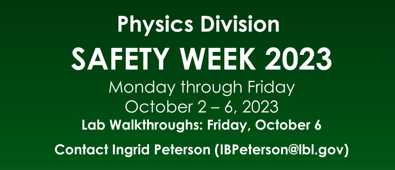 • Multi Lab Safety Week Seminars on Lessons Learned: Tuesday, 10/3/23 and Wednesday, 10/4/23 – Zoom Link https://lbnl.zoom.us/j/96264635723